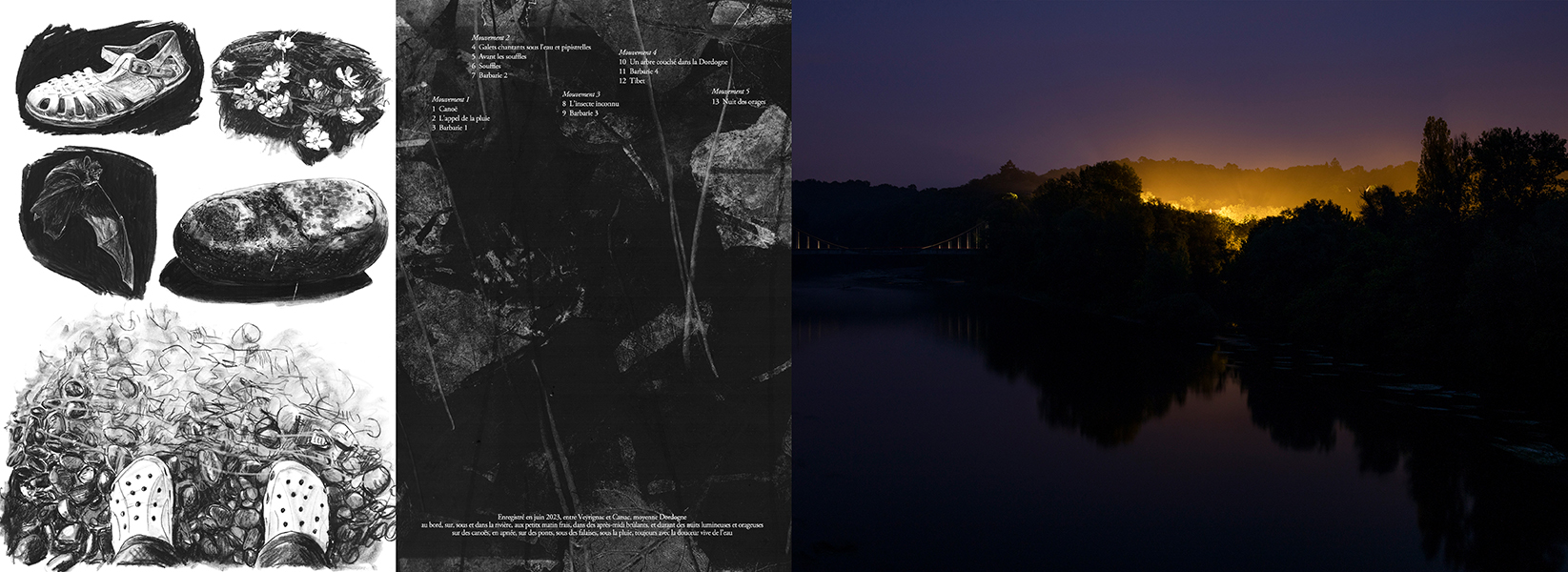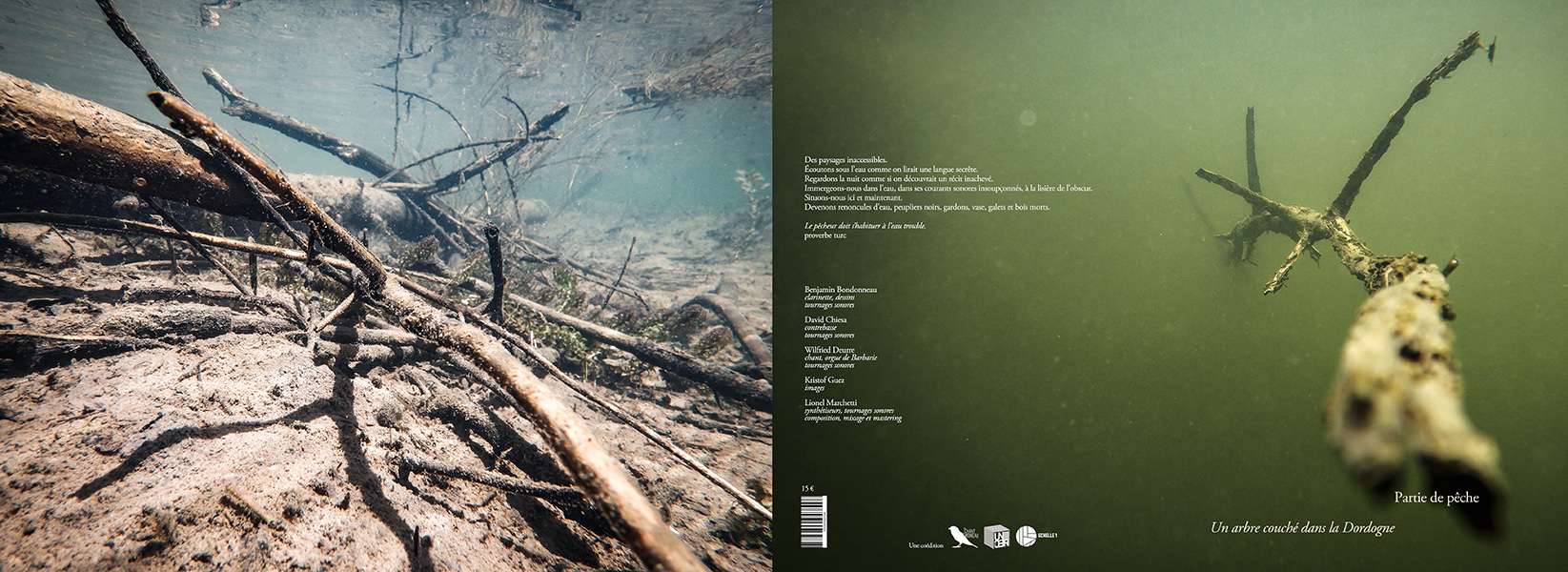 Cinq artistes ont exploré les fonds et les nuits de la rivière Dordogne. Prises de sons et prises de vue in-situ, créations spontanées et lutherie sauvage, clarinette et contrebasse, chant et orgue de Barbarie, photos, dessins, et musique concrète sont les outils pour capter et relater les deux pans de ces paysages encore mystérieux, hydrophiles et nocturnes.